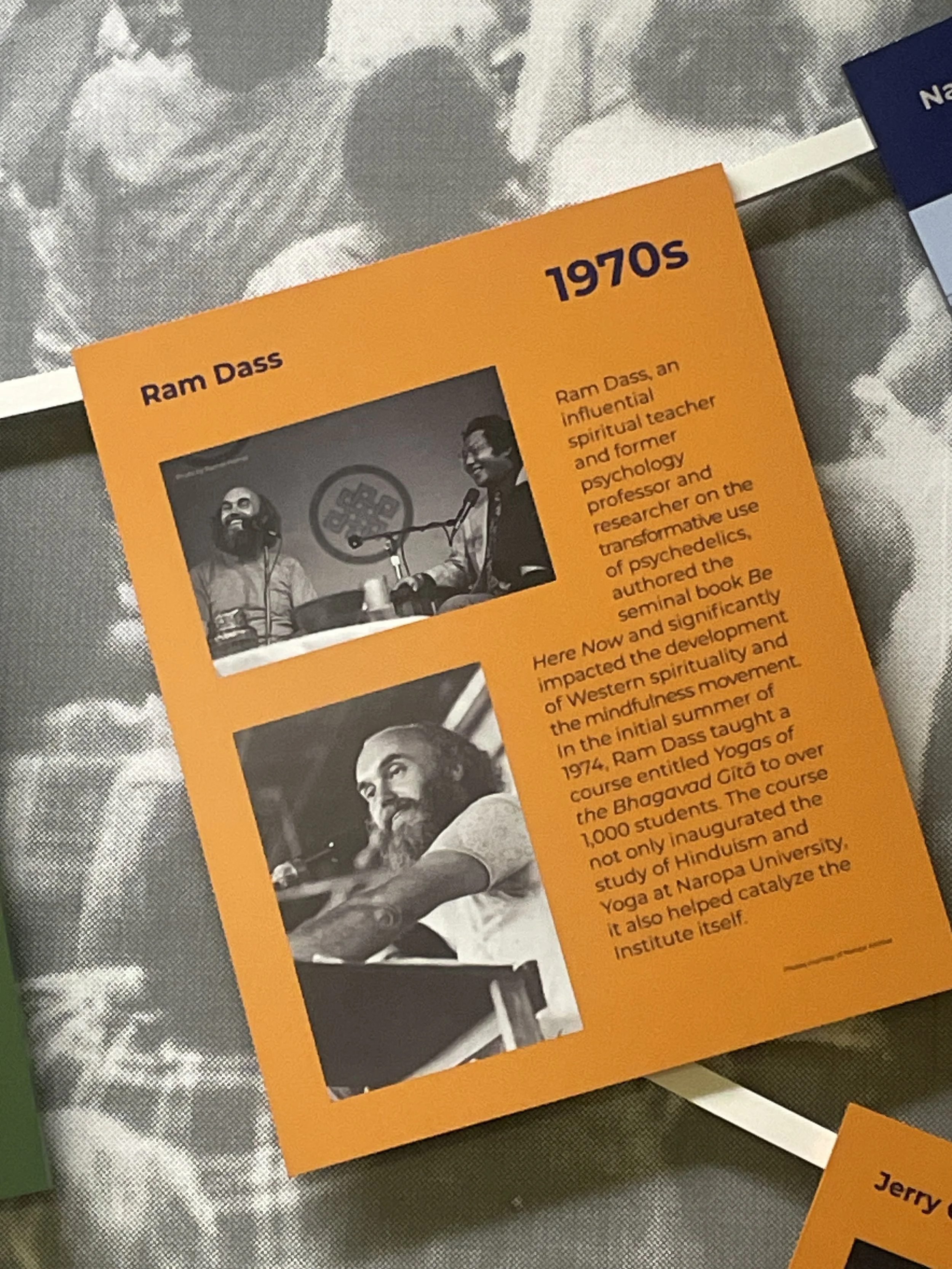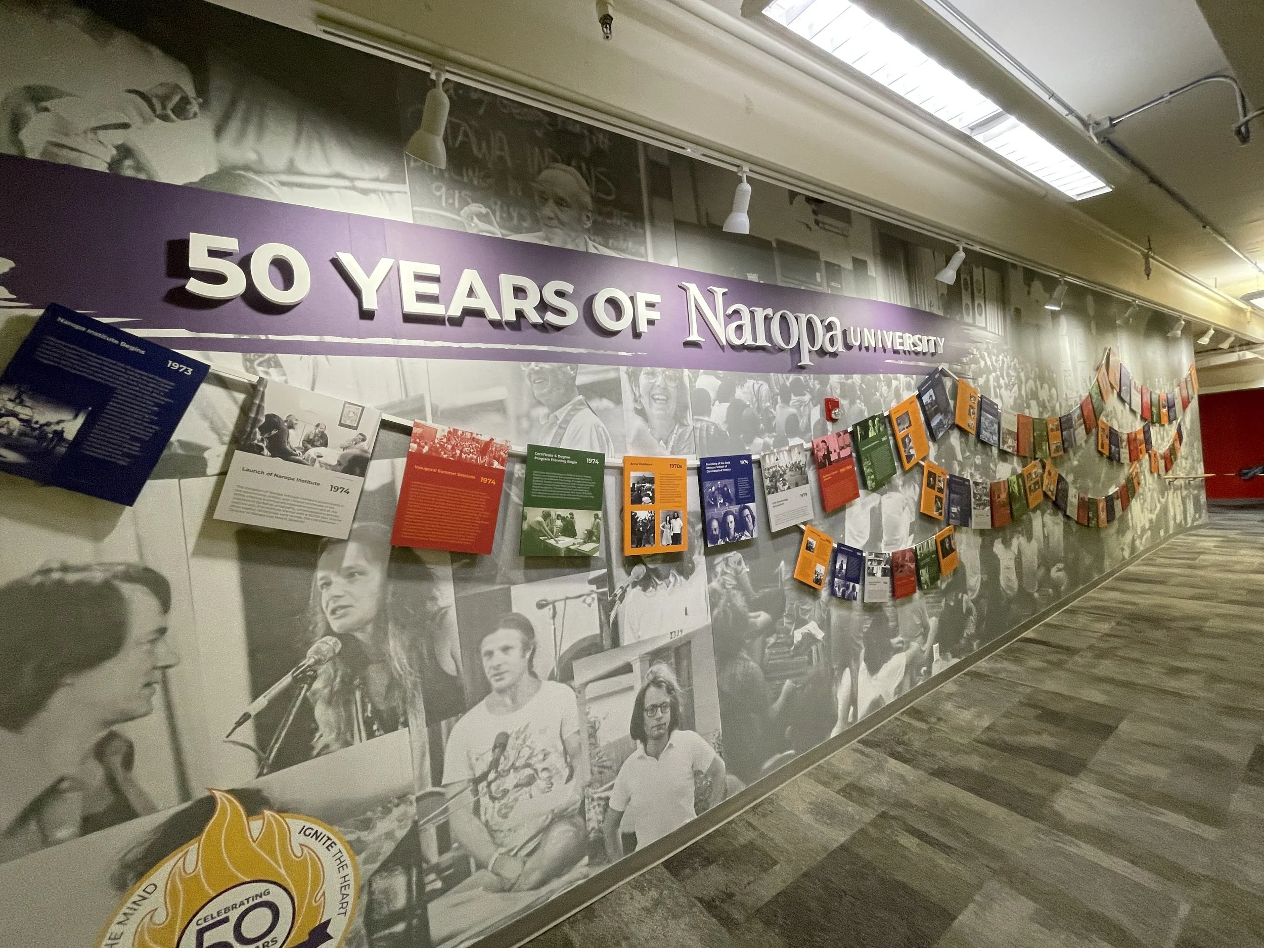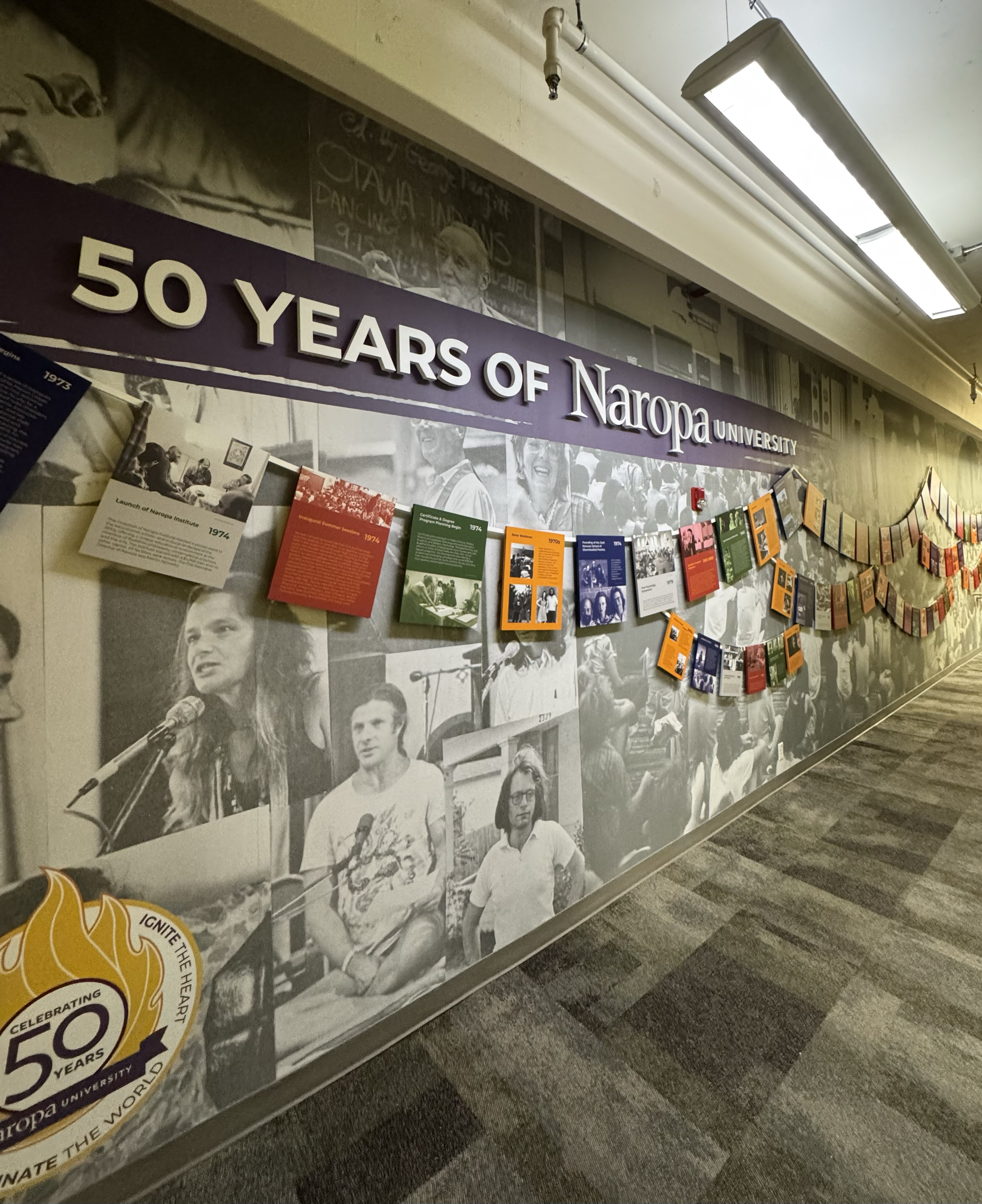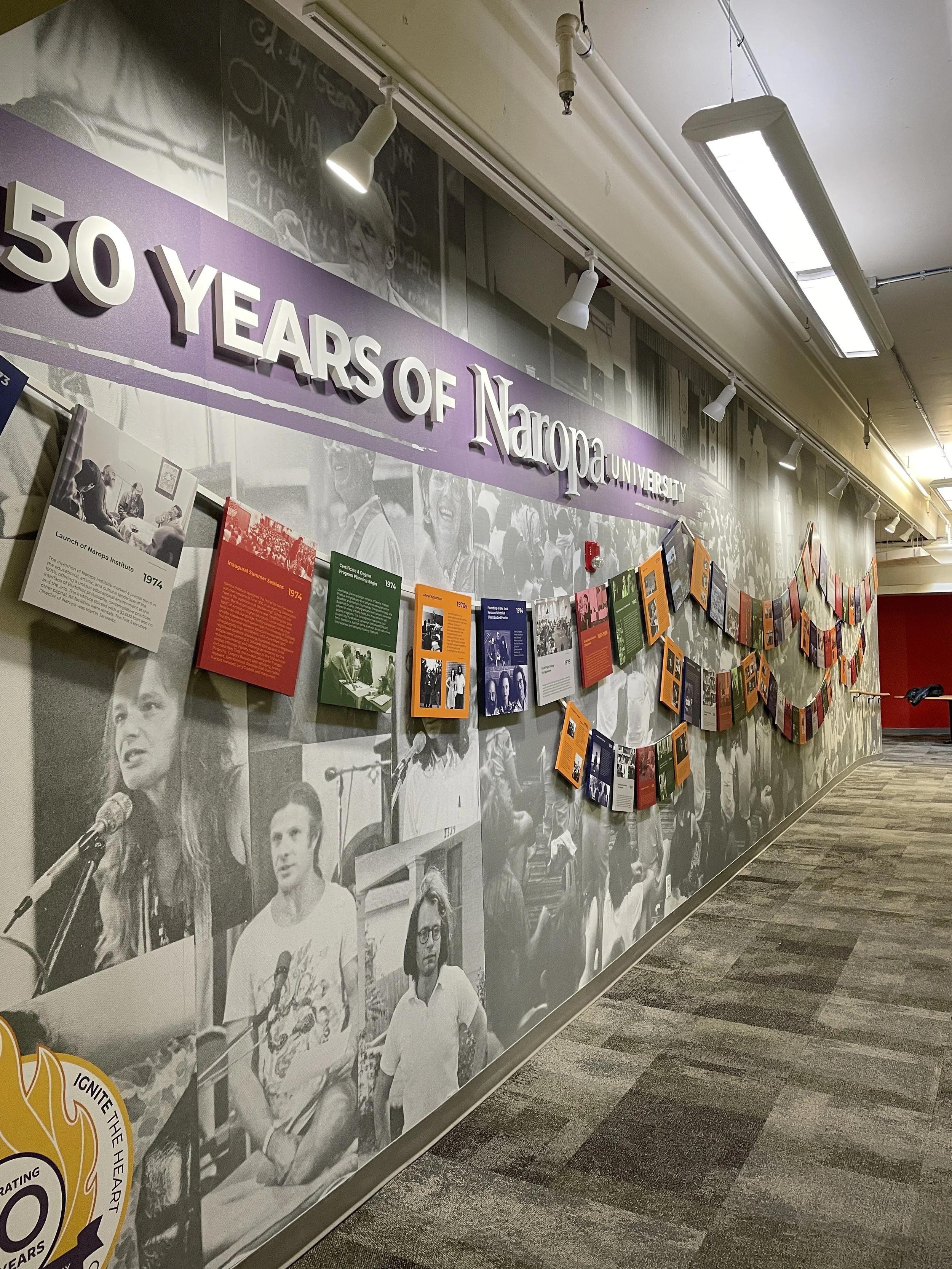 The wall features blown-up archival images from the university’s formative years, spotlighting prominent figures from the 1960s and 70s such as Chögyam Trungpa Rinpoche, Allen Ginsberg, and Anne Waldman. These figures were instrumental in shaping Naropa’s identity as a hub for Buddhist education, creative writing, and radical thought.