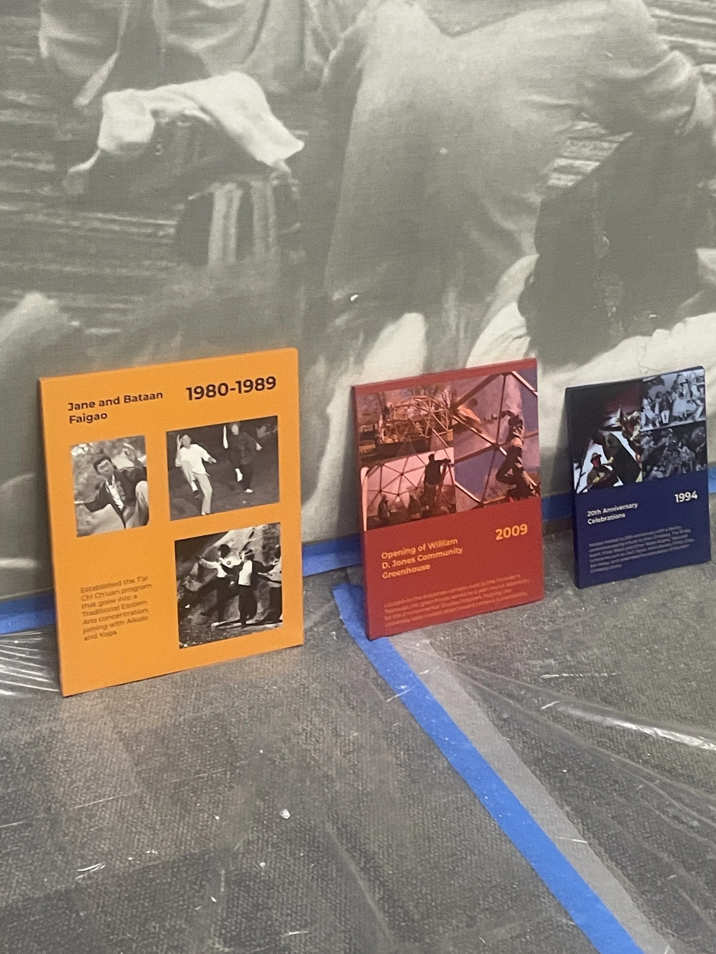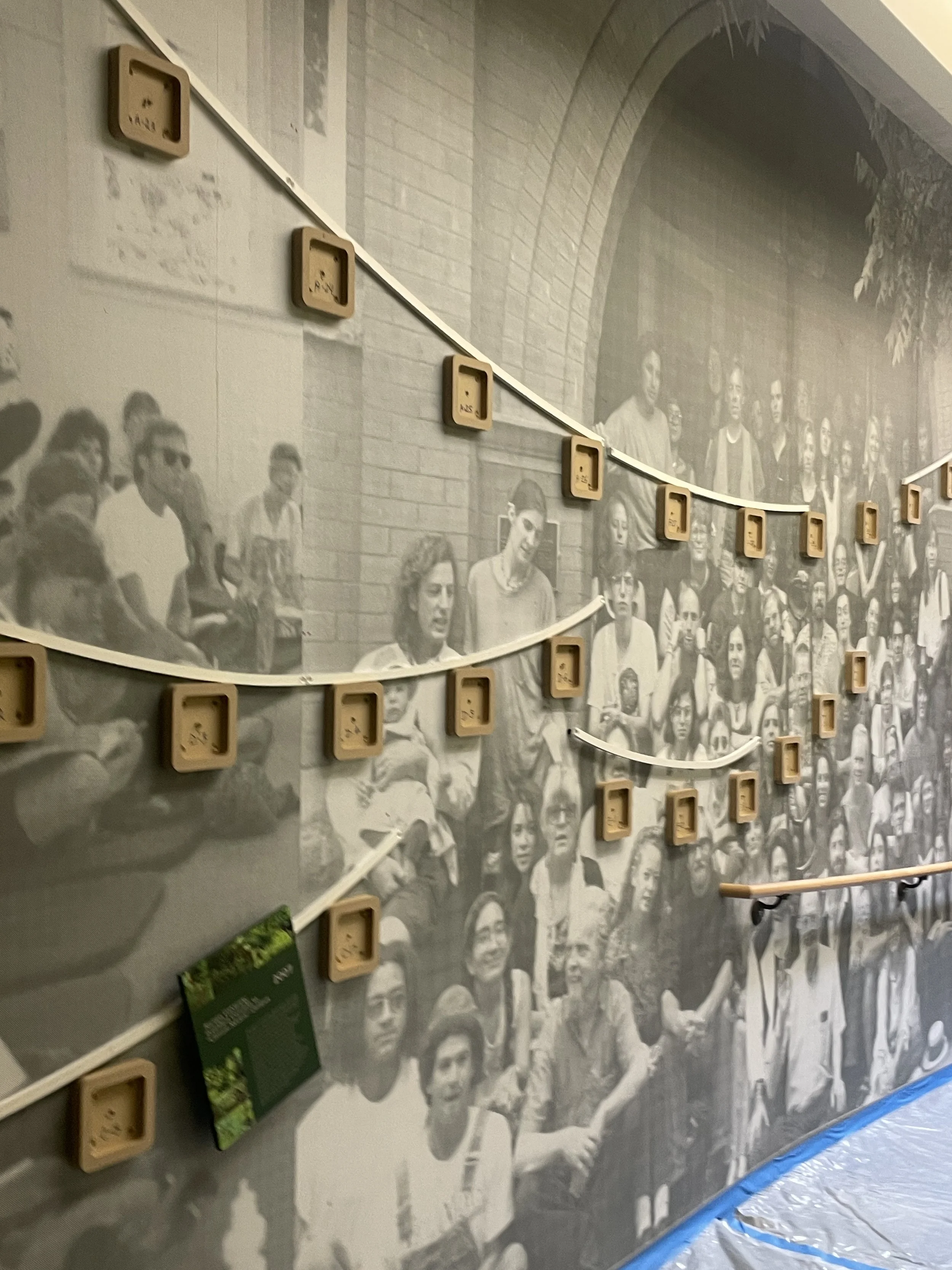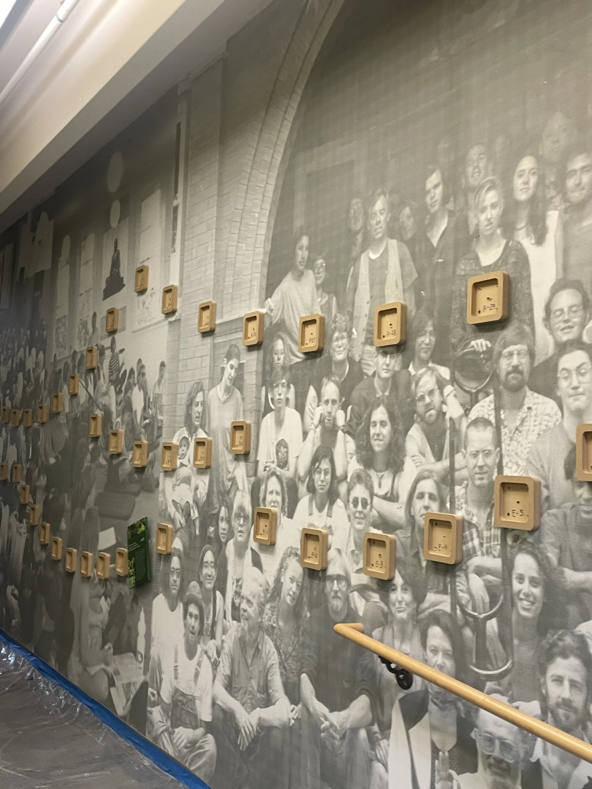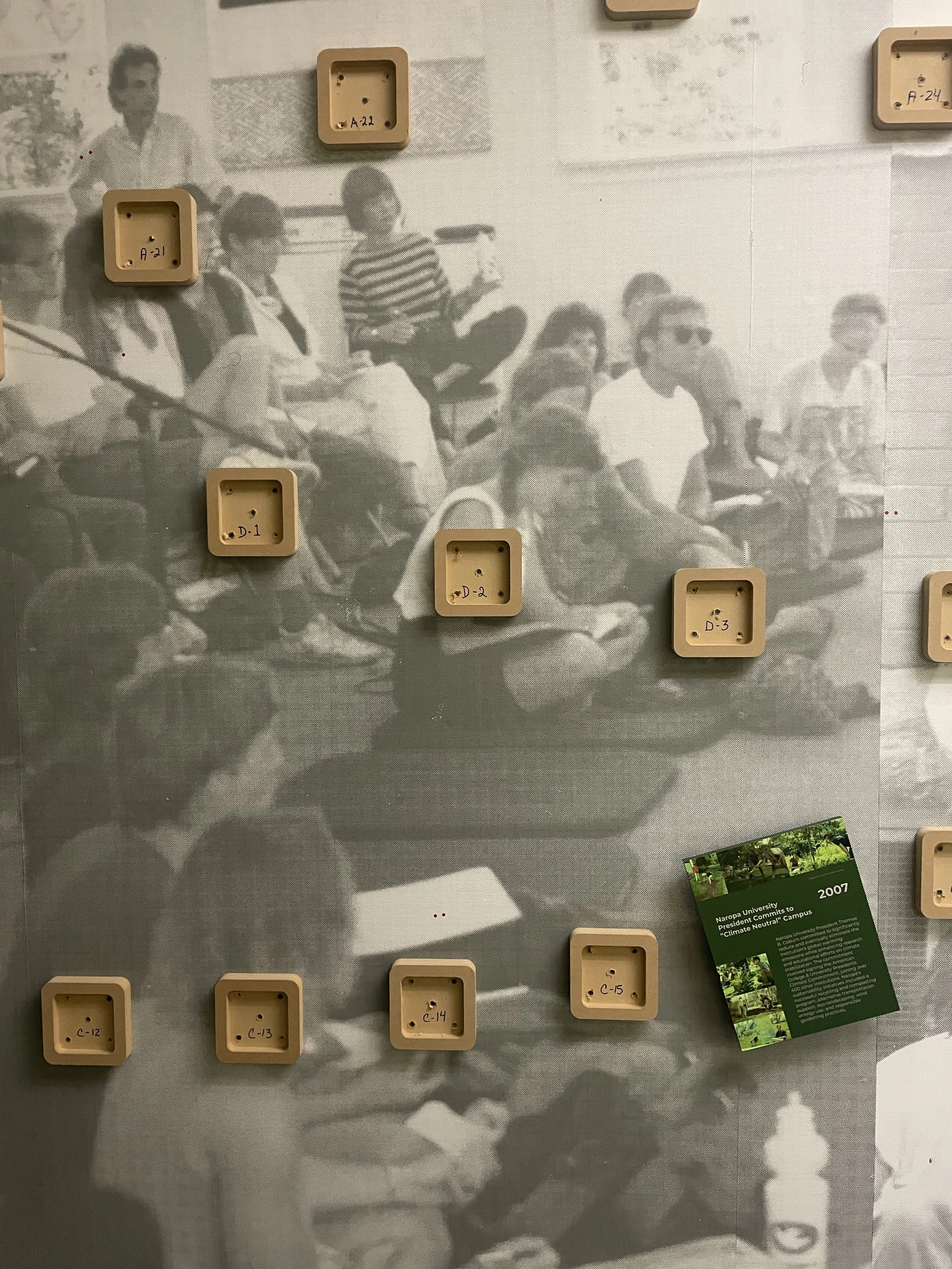 The wall features blown-up archival images from the university’s formative years, spotlighting prominent figures from the 1960s and 70s such as Chögyam Trungpa Rinpoche, Allen Ginsberg, and Anne Waldman. These figures were instrumental in shaping Naropa’s identity as a hub for Buddhist education, creative writing, and radical thought.
